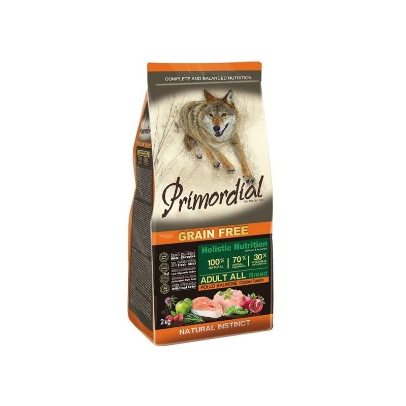 PRIMORDIAL Adult Chicken & Salmon je kompletní strava pro dospělé psy - holistické, bezobilné krmivo s vysokým obsahem kvalitních bílkovin pocházejících z čerstvého masa. Krmivo je bez obilovin a díky tomu má nízký glykemický index.