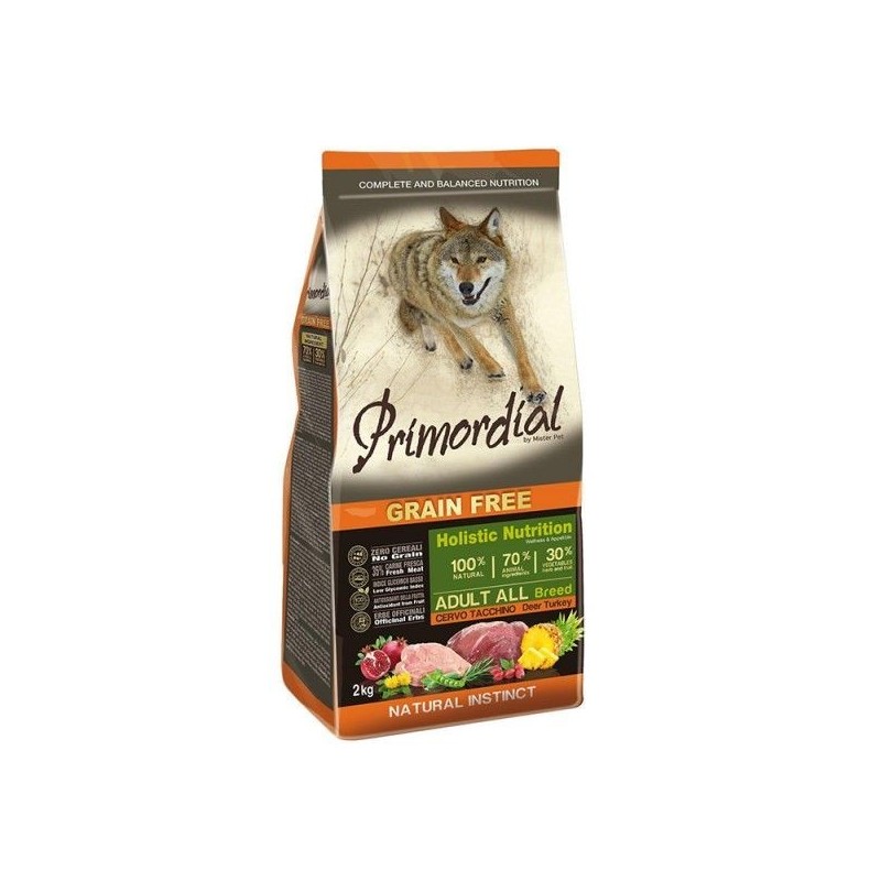 PRIMORDIAL Adult Deer & Turkey je kompletní strava pro dospělé psy - holistické, bezobilné krmivo s vysokým obsahem kvalitních bílkovin pocházejících z čerstvého masa. Krmivo je bez obilovin a díky tomu má nízký glykemický index.